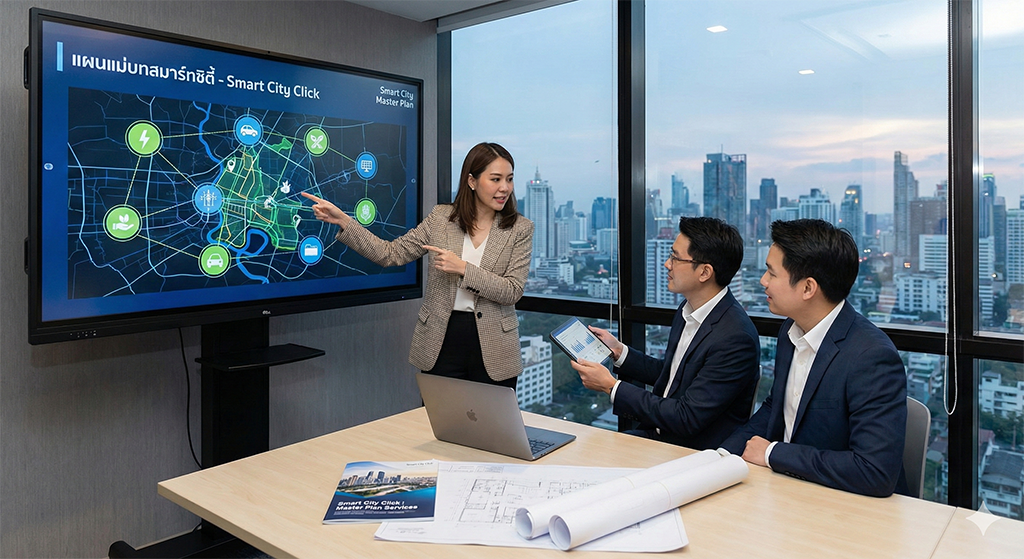 ความสำเร็จของการพัฒนาเมืองอัจฉริยะ ไม่ได้เริ่มต้นที่การซื้อเทคโนโลยี แต่เริ่มต้นที่ “การวางแผนที่แม่นยำ” Smart City Click พร้อมเป็นพาร์ทเนอร์เคียงข้างคุณในการออกแบบพิมพ์เขียวการพัฒนาเมืองที่สอดคล้องกับบริบทพื้นที่ งบประมาณ และวิสัยทัศน์ของผู้บริหาร