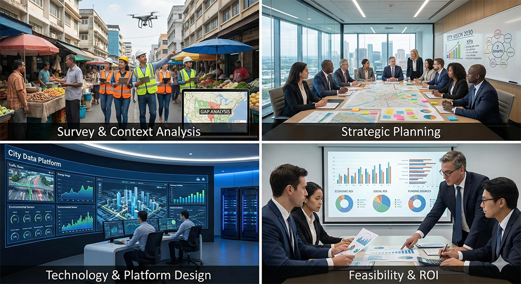 ทีมผู้เชี่ยวชาญลงพื้นที่จริงเพื่อประเมินสภาพปัจจุบันของเมือง ทั้งระบบสาธารณูปโภค การจราจร สิ่งแวดล้อม และความพร้อมของระบบดิจิทัลพื้นฐาน (เช่น โครงข่ายอินเทอร์เน็ต, CCTV เดิม) เพื่อหาช่องว่าง (Gap Analysis) ระหว่างสิ่งที่มีอยู่กับสิ่งที่ควรจะเป็น - การรับฟังเสียงของเมือง (Deep Stakeholder Engagement)